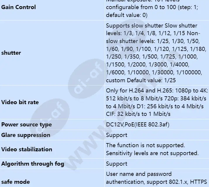 Support 1 TOPS computing power; Support behavioral analysis, population analysis, target, human body Adopt 1/2.7" CMOS; 120dB super wide dynamic, strong contrast scene to restore true details; Behavior analysis Fast movement/Tripwire crossing/Intrusion/Area entry or exit/Loitering Crowd situation analysis Queue length/Head counting/Crowd flow statistics Target Target detection human body Human detection Chip Hi3516DV300 Computing power 1 TOPS RAM DDR3 0.2500 GB Flash SPI NAND FLASH Sensor maximum image size 2MP 1920(H)*1080(V) Sensor photosensitive surface size 1/2.7" CMOS Minimum illumination Color: 0.002 lux (F1.6, AGC ON); B/W: 0.001 lux (F1.6, AGC ON) Lens focal length 3.6mm Camera angle Horizontal: 87°; vertical: 46.2° White light fill distance 30m Video Encoding Format