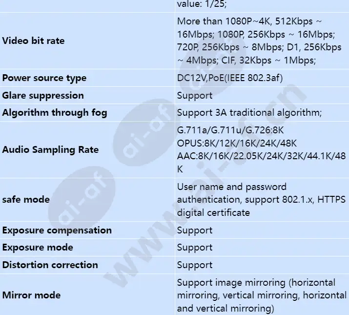 Support 1 TOPS computing power; Support behavioral analysis, population analysis, target, human body Support backlight adaptive, fog penetration adaptive; Adopt 1/2.7" CMOS; Software definition, support algorithm online loading and upgrading; 120dB super wide dynamic, strong contrast scene to restore true details; Support for starry / full color / intelligent fill light, etc. Built-in dual MIC, speaker, and speech reminder in realization; Built-in rich scene voice and support custom voice import; Behavior analysis Fast movement/Tripwire crossing/Intrusion/Area entry or exit/Loitering/Battery Vehicle Detection Crowd situation analysis Queue length statistics, area population statistics, people flow statistics, detection before departure Target Target detection/Target attribute recognition