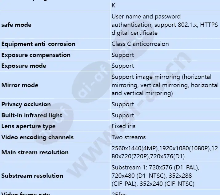 Support backlight adaptive, fog penetration adaptive; Using 1/3" CMOS; 120dB super wide dynamics, strong contrast scenario restore real details; Support 30m infrared, 20m white light; Built-in microphone, supports sound pickup; Support PoE power supply; Behavior Analysis Video Mode Human figure detection Resolution 4MP 2560(H)*1440(V) Sensor photosensitive surface size 1/3" CMOS Minimum illumination Color: 0.005Lux (F1.2, AGC ON, 1/30 shutter), B/W: 0.0025Lux (F1.2, AGC ON, 1/30 shutter), 0Lux (IR on) Lens focal length 3.6mm Camera angle Horizontal: 78°; Vertical: 42° and above angle error ±5% Infrared light fill distance 30m White light fill distance 20m Video Encoding Format H.264/H.265 Video frame rate 25fps Audio encodingformat G.711a/G.711u/G.726/AAC (default G.711a) Ethernet