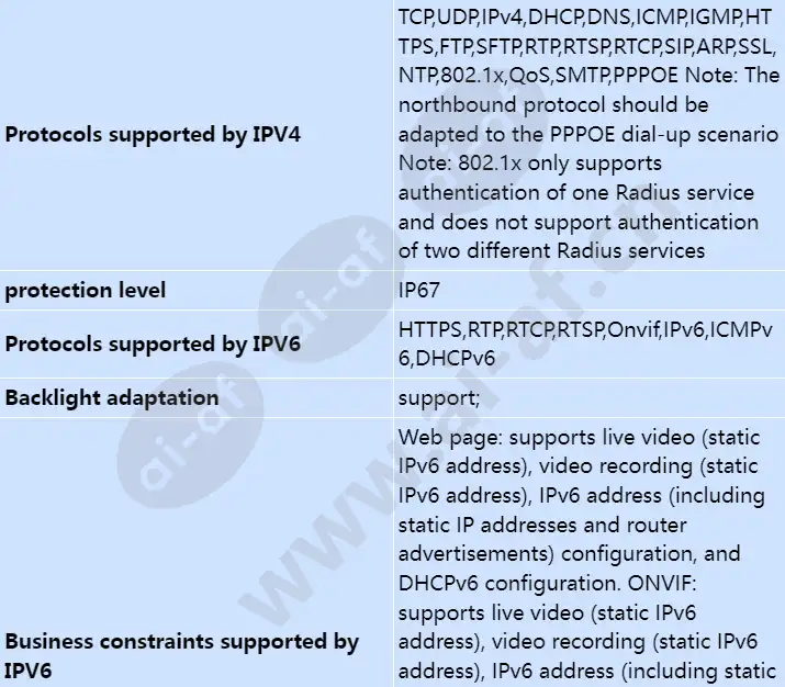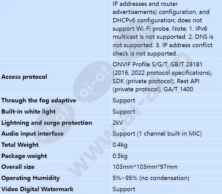 Support 1 TOPS computing power; Support Behavioral Analysis, Goals; Support backlight adaptive, fog penetration adaptive; Adopt 1/2.7" CMOS; 120dB super wide dynamic, strong contrast scene to restore true details; Support dual light fill light, voice intercom function; Deep learning perimeter algorithm, effectively filtering the interference of light and shadow changes; Supports accurate identification of people, vehicles, and non-motor vehicles in the perimeter function; Support POE power supply; Behavior Analysis Video Mode Fast movement/Tripwire crossing/Intrusion/Area entry or exit/Loitering Computing power 1 TOPS Resolution 4MP 2560(H)*1440(V) Sensor photosensitive surface size 1/2.7" CMOS Minimum illumination Color: 0.005 lux (F1.2, AGC ON, 1/30s shutter speed); B/W: 0.0025 lux