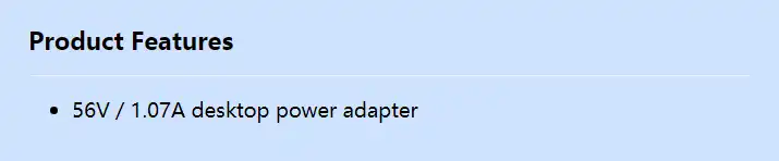 56V / 1.07A desktop power adapter Net weight 0.245kg Operating temperature -25°C~50°C Certification UL,CCC,CE,BSMI,BIS,RCM,PSE,BIS,RCM,Erp,Co,V5Tier2,DOE,CB,FCC,CEC Gross weight 0.365kg Product dimensions 130*55*30.5mm Packing dimensions 230*140*70mm Application scenario Applicable to cameras that use 56 V DC power supply Auxiliary voltage range 90-290VAC Rated output voltage DC 56V Rated maximum load 1.07A