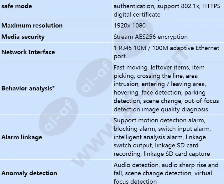 Uses 1 / 1.8" progressive scan CMOS Support independent dual 1080P HD encoding Support H.265 / H.264 HD low code stream encoding Day and night monitoring, day and night monitoring, low light enhancement Supports ultra-wide dynamics Support fog function Built-in infrared fill light, support intelligent infrared, maximum fill distance 30 meters Built-in power zoom, power focus lens, support auto focus and synchronous focus Support intelligent behavior analysis, audio analysis, scene change, out-of-focus detection, image quality diagnosis; support for basic face detection *, parking detection * Support SEC super strong error correction Support agile network iPCA transmission quality diagnosis Support stream AES encryption Ultra-wide operating voltage range and ultra-wide operating