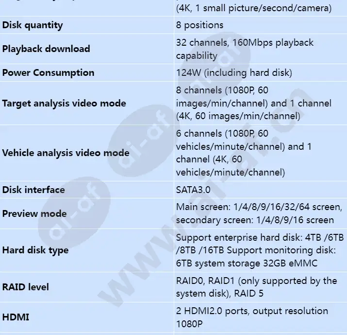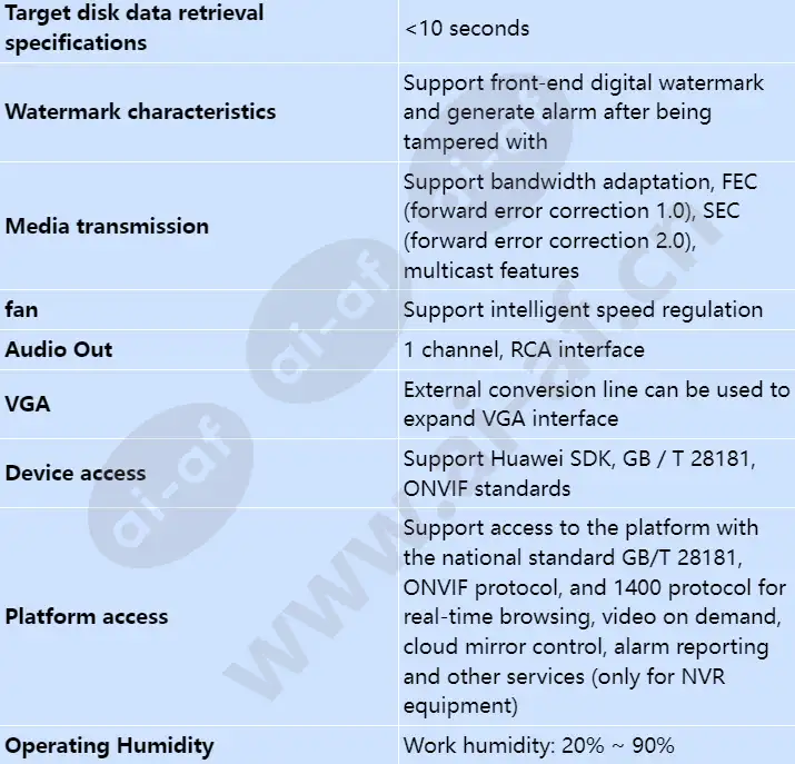 High performance and flexible application Multiple intelligent analysis Easy to deploy and maintain High performance and flexible application 64 network video access, 320Mbps video input bandwidth Support video and picture mixed storage Support algorithm plug-in access and management Support stand-alone, multi-machine network mode, high reliability Support SafeVideo technology, the remaining disks after RAID5 failure can be read and written Support cache supplement recording technology to ensure the integrity of video data Supports video lock function to protect important videos from being overwritten within a specified period Support data safe function, double backup of key system data Adopts embedded Linux operating system, supports 7 x 24 hours stable operation, and is not easy to be