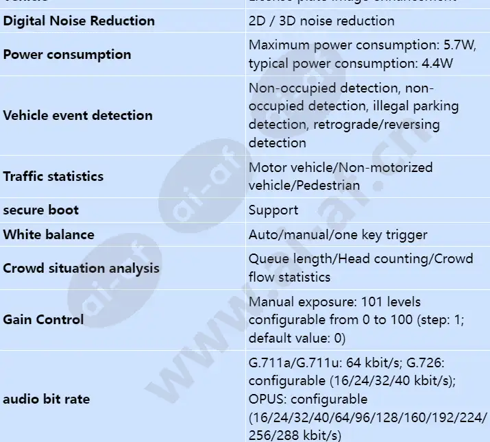 Support 2 TOPS computing power; Supports multi-algorithm handling, behavioral analysis, people's situation analysis, target, human, machine non-human, vehicle, vehicle event testing, traffic data statistics Support backlight adaptive, fog penetration, speed adaptive; Adopt 1/1.8" CMOS; Digital wide dynamic super wide dynamic, strong contrast scenes restore real details; Support multiple algorithm switching; Support full structured; Chip Hi3519AV100 Computing power 2 TOPS RAM DDR4 1.0 GB Flash SPI NAND FLASH 512.0 MB Sensor maximum image size 2MP 1920(H)*1080(V) Sensor photosensitive surface size 1/1.8" CMOS Minimum illumination Color: 0.001Lux (F1.2, AGC ON, 1/30 shutter), black and white: 0.0001Lux (F1.2, AGC ON, 1/30 shutter) Video Encoding Format MJPEG/H.264/H.265 Audio encodingformat