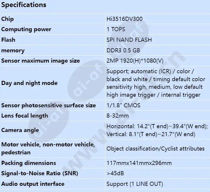 Support 1 TOPS computing power; Supports multi-algorithm handling, behavioral analysis, people's situation analysis, target, human, machine non-human, vehicle, vehicle event testing, traffic data statistics Support backlight adaptive, fog penetration adaptive; Adopt 1/1.8" CMOS; Software definition, support algorithm online loading and upgrading; 120dB super wide dynamics, strong contrast scenario restore real details; Vehicle Chinese mainland brand recognition, body color detection, vehicle model detection, vehicle model detection Vehicle event detection Non-occupied detection, non-occupied detection, illegal parking detection, retrograde/reversing detection Traffic statistics Motor vehicle/Non-motorized vehicle/Pedestrian Behavior analysis Fast movement/Tripwire crossing/Intrusion/Area
