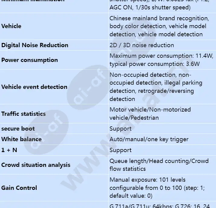 Support 1 TOPS computing power; Support full structure, 1-to-N function, behavior analysis, crowd situation analysis, target, human body, machine non-human, vehicle, vehicle event detection, traffic data statistics; Support backlight adaptive, fog penetration adaptive; Adopt 1/1.8" CMOS; Software definition, support algorithm online loading and upgrading; 120dB super wide dynamic, strong contrast scene to restore true details; Support class D anti-corrosion, adapt to salt spray environment; Vehicle Chinese mainland brand recognition, body color detection, vehicle model detection, vehicle model detection Vehicle event detection Non-occupied detection, non-occupied detection, illegal parking detection, retrograde/reversing detection Traffic statistics Motor vehicle/Non-motorized