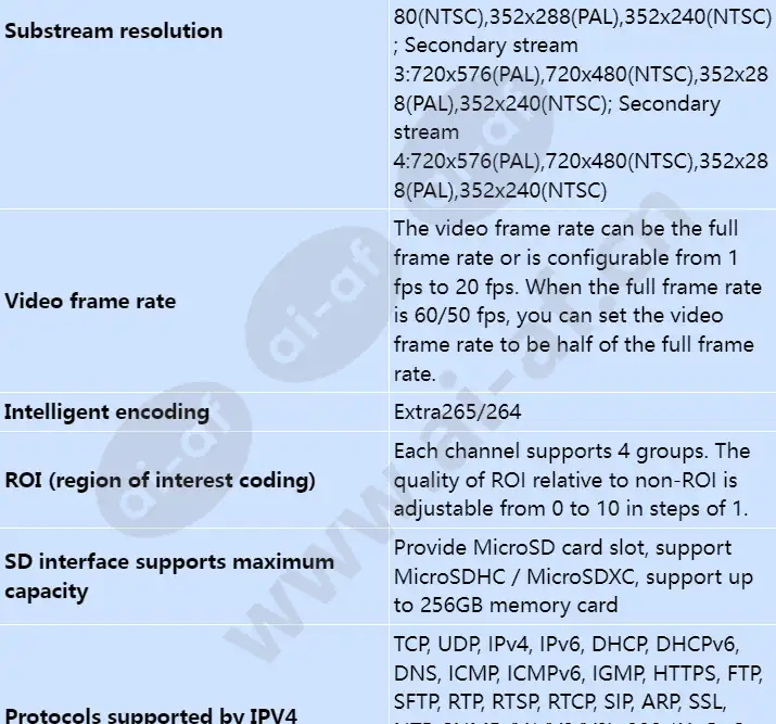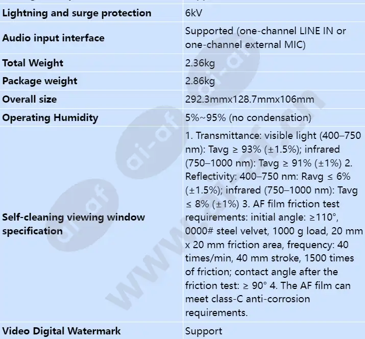 Support for the target; Adopt 1/1.8" CMOS; 120dB super wide dynamic, strong contrast scene to restore true details; Chip Hi3519V101 RAM DDR3 1.0 GB Flash SPI NAND FLASH 256.0 MB Sensor maximum image size 2MP 1920(H)*1080(V) Sensor photosensitive surface size 1/1.8" CMOS Minimum illumination Color: 0.0004 lux (F1.6, AGC ON); B/W: 0.0001 lux (F1.6, AGC ON) Lens focal length 8-32mm Camera angle Horizontal: 13.44° (T) to 42.3° (W); vertical: 7.7° (T) to 23.34° (W) White light fill distance 15m Video Encoding Format MJPEG/H.264/H.265 Audio encodingformat G.711a/G.711u/G.726/OPUS Target Target attribute recognition RS485 interface Support Digital interface Support Ethernet interface Support Number of Ethernet interfaces 1 Ethernet interface bandwidth 1 RJ45 10M / 100M / 1000M adaptive Ethernet