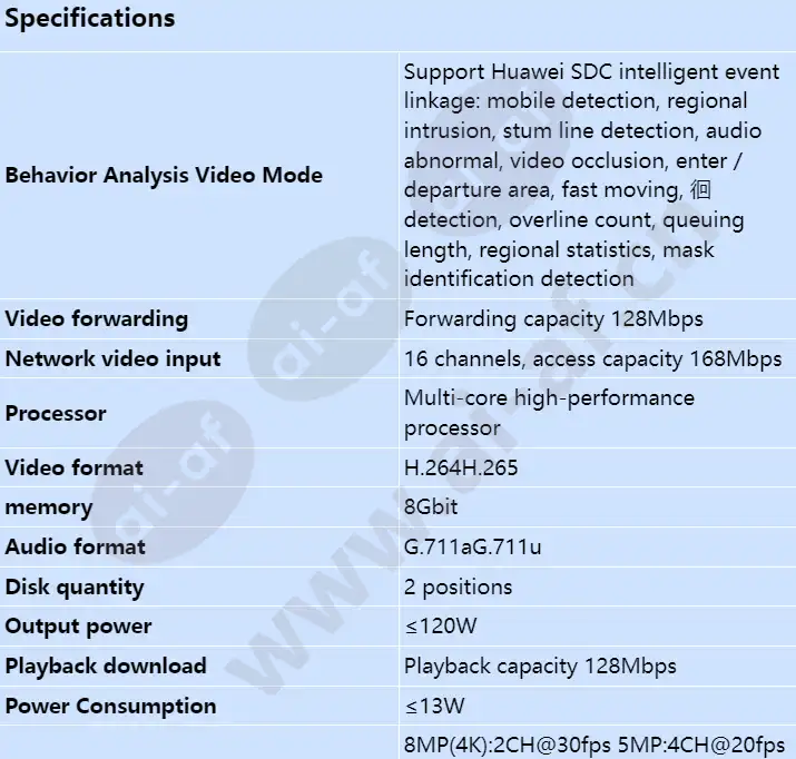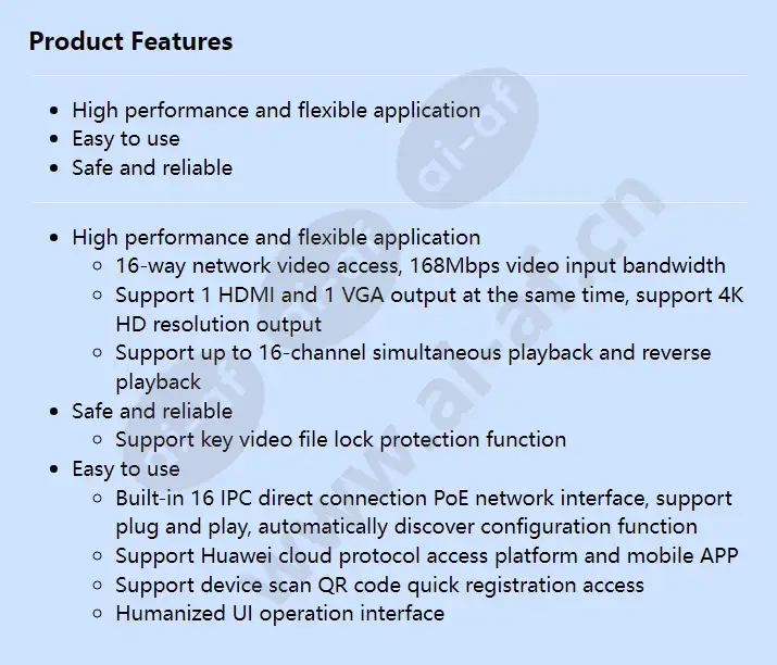 High performance and flexible application Easy to use Safe and reliable High performance and flexible application 16-way network video access, 168Mbps video input bandwidth Support 1 HDMI and 1 VGA output at the same time, support 4K HD resolution output Support up to 16-channel simultaneous playback and reverse playback Safe and reliable Support key video file lock protection function Easy to use Built-in 16 IPC direct connection PoE network interface, support plug and play, automatically discover configuration function Support Huawei cloud protocol access platform and mobile APP Support device scan QR code quick registration access Humanized UI operation interface Network video input 16 channels, access capacity 168Mbps Video forwarding Forwarding capacity 128Mbps Playback download