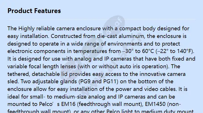 The Highly reliable camera enclosure with a compact body designed for easy installation. Constructed from die-cast aluminum, the enclosure is designed to operate in a wide range of environments and to protect electronic components in temperatures from –30° to 60°C (–22° to 140°F). It is designed for use with analog and IP cameras that have both fixed and variable focal length lenses (with or without auto iris operation). The tethered, detachable lid provides easy access to the innovative camera sled. Two adjustable glands (PG9 and PG11) on the bottom of the enclosure allow for easy installation of the power and video cables. It is ideal for small- to medium-size analog and IP cameras and can be mounted to Pelco’s EM16 (feedthrough wall mount), EM1450 (non-feedthrough wall mount), or any
