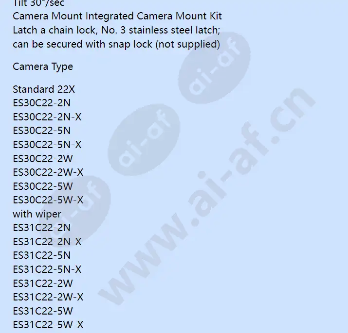 ES30C22-2N-X Pelco Analog Integrated PTZ IOP Camera ES30C/ES31C Series Positioning System ESPRIT® system with IOP camera and wiper option • Receiver, pan/tilt, and housing with integrated optical package (IOP) • Configurable camera settings • Configurable camera title • The screen can display the horizontal orientation, tilt angle and zoom factor • Auto iris, manual priority • Auto Focus, Manual Priority • AC Cord Lock • Pan variable speed rotation: 0.1 deg/s to 100 deg/s, proportional pan • 360° continuous pan rotation • Region masking allows setting up to 8 regions (configurable size) to output blank video • Tilt range: +33° to -83° from horizontal • Support preset position, automatic inspection mode and multiple scanning modes • Low maintenance design, no gear adjustment required •
