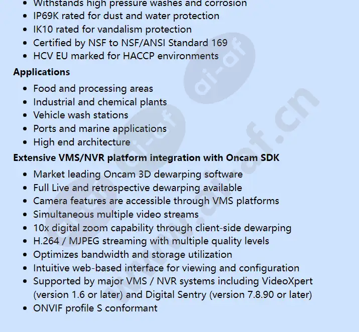 The EVO-12-SSK from Pelco is a 12 megapixel network IP outdoor surface mount 360º camera. Features 12MP sensor and no moving parts 0.2 lux minimum illumination and electronic WDR 12MP high-resolution sensor Up to 30 fps at 2.0 MP 0.1 lux minimum illumination Constant 360° surveillance with no blind spots No moving parts, no maintenance and silent operation PoE or 12 VDC powered Advanced features Local SD card slot for event recording Configurable privacy regions Polygonal video motion detection regions Local alarm digital input and output Audio microphone input Uniquely suited for extreme environments Electropolished marine grade 316 stainless steel Withstands high pressure washes and corrosion IP69K rated for dust and water protection IK10 rated for vandalism protection Certified by NSF