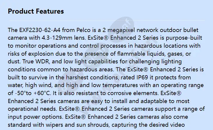 The EXF2230-62-A4 from Pelco is a 2 megapixel network outdoor bullet camera with 4.3-129mm lens. ExSite® Enhanced 2 Series is purpose-built to monitor operations and control processes in hazardous locations with risks of explosion due to the presence of flammable liquids, gases, or dust. True WDR, and low light capabilities for challenging lighting conditions common to hazardous areas. The ExSite® Enhanced 2 Series is built to survive in the harshest conditions, rated IP69 it protects from water, high wind, and high and low temperatures with an operating range of -50°to +60°C. It is also resistant to corrosive elements. ExSite® Enhanced 2 Series cameras are easy to install and adaptable to most operational needs. ExSite® Enhanced 2 Series cameras support a range of input power options.
