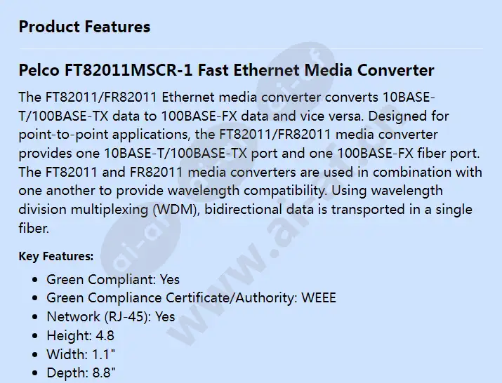 Pelco FT82011MSCR-1 Fast Ethernet Media Converter The FT82011/FR82011 Ethernet media converter converts 10BASE-T/100BASE-TX data to 100BASE-FX data and vice versa. Designed for point-to-point applications, the FT82011/FR82011 media converter provides one 10BASE-T/100BASE-TX port and one 100BASE-FX fiber port. The FT82011 and FR82011 media converters are used in combination with one another to provide wavelength compatibility. Using wavelength division multiplexing (WDM), bidirectional data is transported in a single fiber. Key Features: Green Compliant: Yes Green Compliance Certificate/Authority: WEEE Network (RJ-45): Yes Height: 4.8 Width: 1.1" Depth: 8.8" Product Series: FT82011 Form Factor: Wall Mountable Form Factor: Rack-mountable Form Factor: External Network Technology: