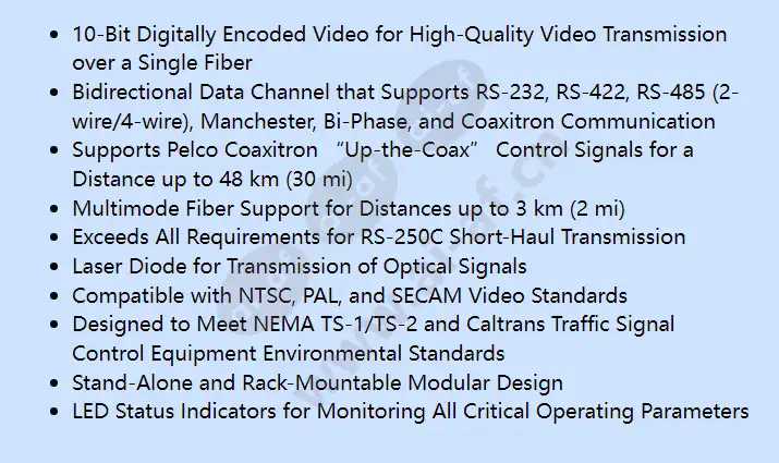 The FTV10D1M1ST fiber transmitter allow transmission of one unidirectional composite video channel and one bidirectional data channel over one optical fiber. In addition, the “up-the-coax” technology allows Coaxitron pan/tilt/zoom (PTZ) control data to be transmitted the full distance of the fiber. The FTV10D1M1ST plug-and-play design ensures ease of installation by requiring no electrical or optical adjustments. Modular in design, FTV10D1M1ST unit can be rack-mounted using the EURACK/USRACK chassis, or stand-alone modules can be placed on a desktop or mounted to a wall (wall mount kit not required). Features 10-Bit Digitally Encoded Video for High-Quality Video Transmission over a Single Fiber Bidirectional Data Channel that Supports RS-232, RS-422, RS-485 (2-wire/4-wire), Manchester