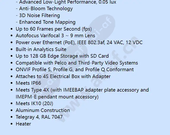 The Sarix Enhanced range camera feature SureVision technology, delivering high definition (HD) resolution, consistent color science, fast processing power, and simultaneous advanced low-light performance with wide dynamic range (WDR) and anti-bloom technologies. New advancements include 3D noise filtering, smooth response to illumination changes, and improved tone mapping to retain color accuracy and overall image contrast. Designed to install quickly, the cameras include autofocus, motorized zoom, built-in analytics, and other advanced features needed for demanding security applications. The IME Series contains an integrated varifocal MPx autofocus lens (3 ~ 9 mm). Form factors include outdoor domes. Feature a sturdy design that is both vandal- and tamper-resistant. The environmental
