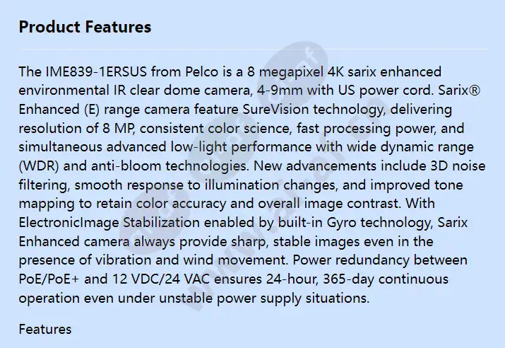 The IME839-1ERSUS from Pelco is a 8 megapixel 4K sarix enhanced environmental IR clear dome camera, 4-9mm with US power cord. Sarix® Enhanced (E) range camera feature SureVision technology, delivering resolution of 8 MP, consistent color science, fast processing power, and simultaneous advanced low-light performance with wide dynamic range (WDR) and anti-bloom technologies. New advancements include 3D noise filtering, smooth response to illumination changes, and improved tone mapping to retain color accuracy and overall image contrast. With ElectronicImage Stabilization enabled by built-in Gyro technology, Sarix Enhanced camera always provide sharp, stable images even in the presence of vibration and wind movement. Power redundancy between PoE/PoE+ and 12 VDC/24 VAC ensures 24-hour