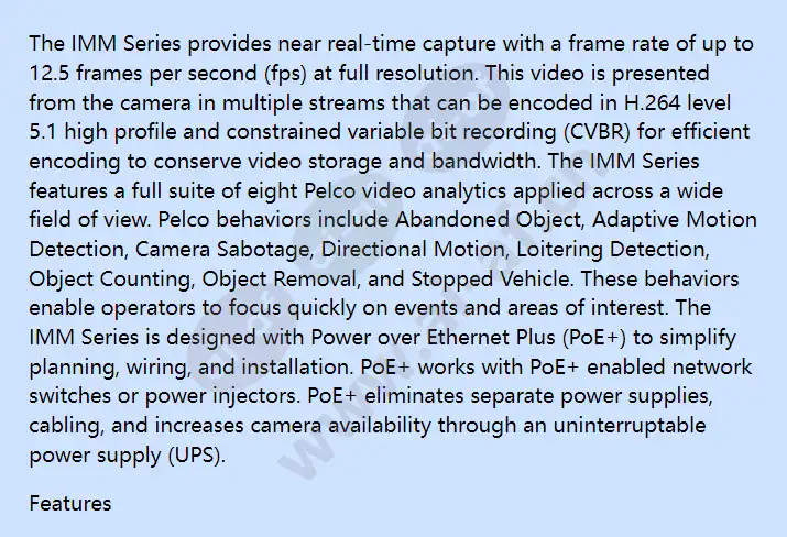 The Optera™ IMM Series camera with SureVision™ 2.0 provides a panomersive experience with seamless situational awareness which provides stitched and blended panoramic views. The IMM Series also enables you to zoom in for detail within multiple intuitive immersive views from a video management system (VMS). Other multi-imager solutions can be disjointed with separate streams out of order. The IMM Series transparently integrates video across all sensors in the camera, presenting a seamless user experience from setup to viewing. The IMM Series offers the panomersive experience with outstanding and industry leading image quality with SureVision 2.0 technology. SureVision 2.0 delivers excellent low-light performance and true wide dynamic range (WDR), consistently and simultaneously. With