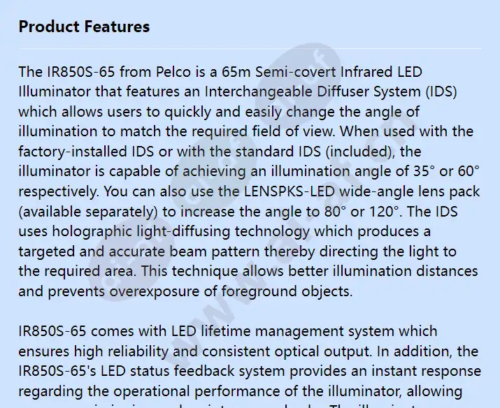 The IR850S-65 from Pelco is a 65m Semi-covert Infrared LED Illuminator that features an Interchangeable Diffuser System (IDS) which allows users to quickly and easily change the angle of illumination to match the required field of view. When used with the factory-installed IDS or with the standard IDS (included), the illuminator is capable of achieving an illumination angle of 35° or 60° respectively. You can also use the LENSPKS-LED wide-angle lens pack (available separately) to increase the angle to 80° or 120°. The IDS uses holographic light-diffusing technology which produces a targeted and accurate beam pattern thereby directing the light to the required area. This technique allows better illumination distances and prevents overexposure of foreground objects. IR850S-65 comes with LED