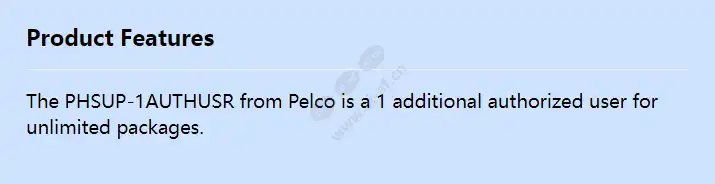 The PHSUP-1AUTHUSR from Pelco is a 1 additional authorized user for unlimited packages.
