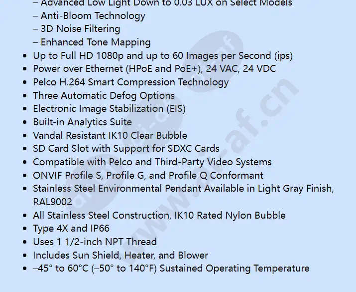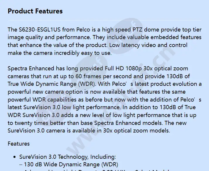 The S6230-ESGL1US from Pelco is a high speed PTZ dome provide top tier image quality and performance. They include valuable embedded features that enhance the value of the product. Low latency video and control make the camera incredibly easy to use. Spectra Enhanced has long provided Full HD 1080p 30x optical zoom cameras that run at up to 60 frames per second and provide 130dB of True Wide Dynamic Range (WDR). With Pelco’s latest product evolution a powerful new camera option is now available that features the same powerful WDR capabilities as before but now with the addition of Pelco’s latest SureVision 3.0 low light performance. In addition to 130dB of True WDR SureVision 3.0 adds a new level of low light performance that is up to twenty times better than base Spectra Enhanced models.