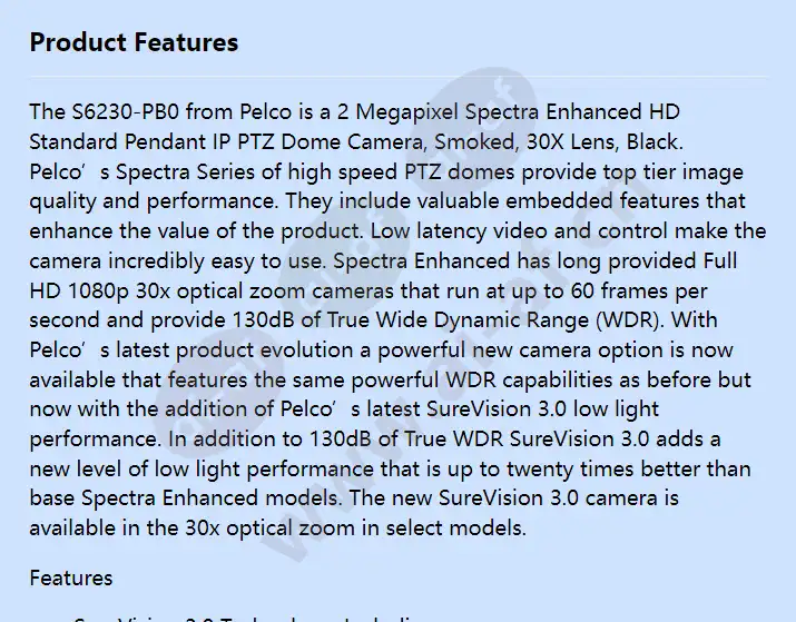 The S6230-PB0 from Pelco is a 2 Megapixel Spectra Enhanced HD Standard Pendant IP PTZ Dome Camera, Smoked, 30X Lens, Black. Pelco’s Spectra Series of high speed PTZ domes provide top tier image quality and performance. They include valuable embedded features that enhance the value of the product. Low latency video and control make the camera incredibly easy to use. Spectra Enhanced has long provided Full HD 1080p 30x optical zoom cameras that run at up to 60 frames per second and provide 130dB of True Wide Dynamic Range (WDR). With Pelco’s latest product evolution a powerful new camera option is now available that features the same powerful WDR capabilities as before but now with the addition of Pelco’s latest SureVision 3.0 low light performance. In addition to 130dB of True WDR
