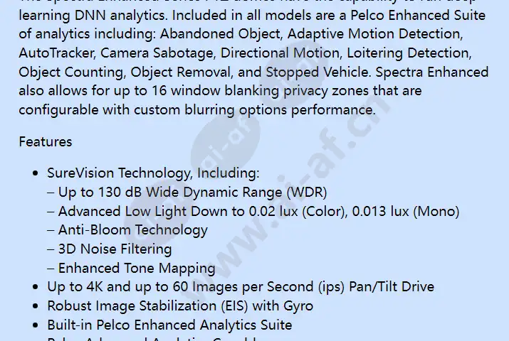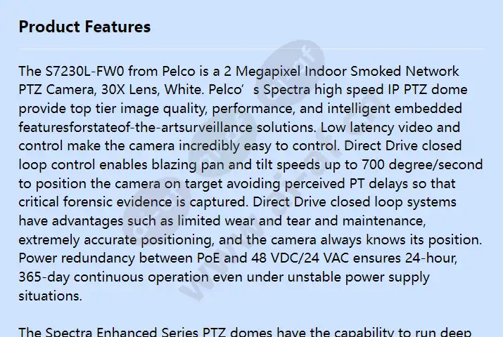 The S7230L-FW0 from Pelco is a 2 Megapixel Indoor Smoked Network PTZ Camera, 30X Lens, White. Pelco’s Spectra high speed IP PTZ dome provide top tier image quality, performance, and intelligent embedded featuresforstateof-the-artsurveillance solutions. Low latency video and control make the camera incredibly easy to control. Direct Drive closed loop control enables blazing pan and tilt speeds up to 700 degree/second to position the camera on target avoiding perceived PT delays so that critical forensic evidence is captured. Direct Drive closed loop systems have advantages such as limited wear and tear and maintenance, extremely accurate positioning, and the camera always knows its position. Power redundancy between PoE and 48 VDC/24 VAC ensures 24-hour, 365-day continuous operation even
