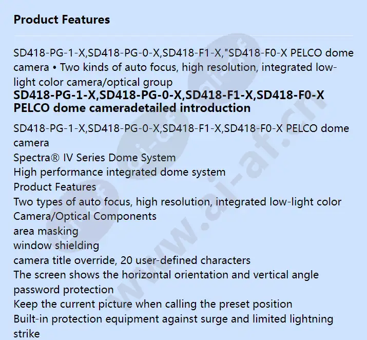 SD418-PG-1-X,SD418-PG-0-X,SD418-F1-X,"SD418-F0-X PELCO dome camera • Two kinds of auto focus, high resolution, integrated low-light color camera/optical group SD418-PG-1-X,SD418-PG-0-X,SD418-F1-X,SD418-F0-X PELCO dome camera detailed introduction SD418-PG-1-X,SD418-PG-0-X,SD418-F1-X,SD418-F0-X PELCO dome camera Spectra® IV Series Dome System High performance integrated dome system Two types of auto focus, high resolution, integrated low-light color Camera/Optical Components area masking window shielding camera title override, 20 user-defined characters The screen shows the horizontal orientation and vertical angle password protection Keep the current picture when calling the preset position Built-in protection equipment against surge and limited lightning strike Integrated Passive UTP