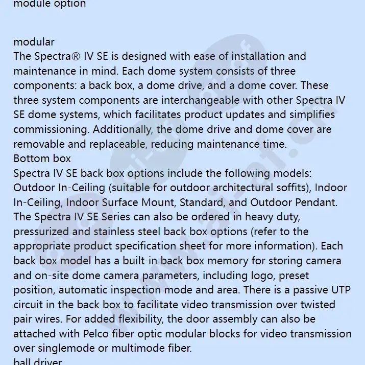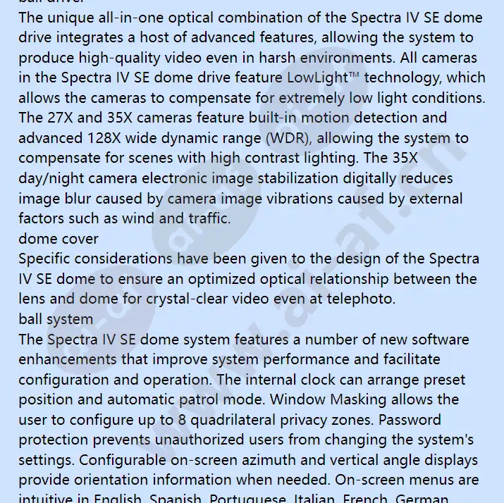 Pelco SD427-F0 Pelco Dome Simulation Spectra® IV SE Series Dome System • Two autofocus, high-resolution all-in-one camera/optics combinations; multiple back box models • Day/Night, 540 TVL, 128X Wide Dynamic Range (WDR), Motion Detection, Image Enhancement and Electronic Image Stabilization (SD435 Series) • Day/Night, 540 TVL, 128X Wide Dynamic Range (WDR) and Motion Monitoring (SD427 Series) • Window Blocking • Camera title overlay, 20 user-defined characters • Horizontal and area masking • The screen shows the horizontal orientation and vertical angle • password protection • Freeze the frame when calling the preset position • Built-in anti-surge and limited lightning protection • Focus Lock • Integrated Passive Unshielded Twisted Pair (UTP) Circuitry • Internal Clock • The IP network