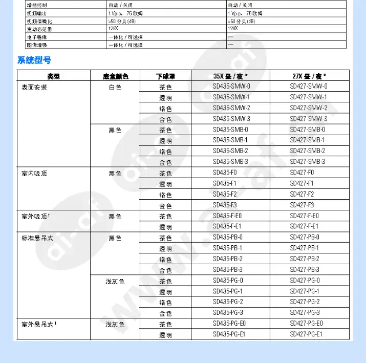 Pelco SD427-PG-E0 Pelco Dome Simulation Spectra® IV SE Series Dome System • Two autofocus, high-resolution all-in-one camera/optics combinations; multiple back box models • Day/Night, 540 TVL, 128X Wide Dynamic Range (WDR), Motion Detection, Image Enhancement and Electronic Image Stabilization (SD435 Series) • Day/Night, 540 TVL, 128X Wide Dynamic Range (WDR) and Motion Monitoring (SD427 Series) • Window Blocking • Camera title overlay, 20 user-defined characters • Horizontal and area masking • The screen shows the horizontal orientation and vertical angle • password protection • Freeze the frame when calling the preset position • Built-in anti-surge and limited lightning protection • Focus Lock • Integrated Passive Unshielded Twisted Pair (UTP) Circuitry • Internal Clock • The IP network