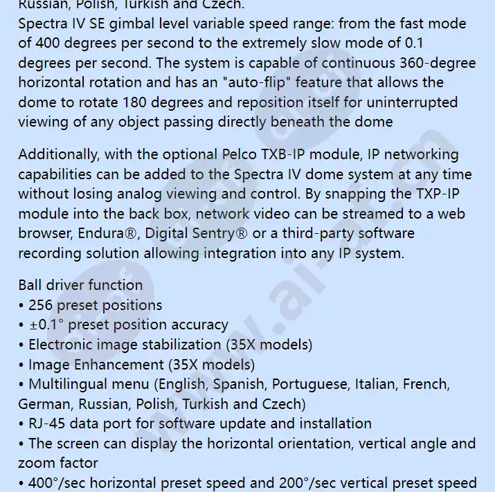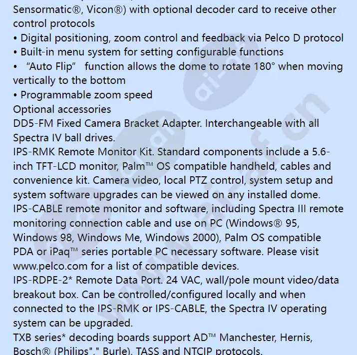 Pelco SD427-SMB-0 Pelco Analog Dome Camera • Two autofocus, high-resolution all-in-one camera/optics combinations; multiple back box models • Day/Night, 540 TVL, 128X Wide Dynamic Range (WDR), Motion Detection, Image Enhancement and Electronic Image Stabilization (SD435 Series) • Day/Night, 540 TVL, 128X Wide Dynamic Range (WDR) and Motion Monitoring (SD427 Series) • Window Blocking • Camera title overlay, 20 user-defined characters • Horizontal and area masking • The screen shows the horizontal orientation and vertical angle • password protection • Freeze the frame when calling the preset position • Built-in anti-surge and limited lightning protection • Focus Lock • Integrated Passive Unshielded Twisted Pair (UTP) Circuitry • Internal Clock • The IP network function can be increased by