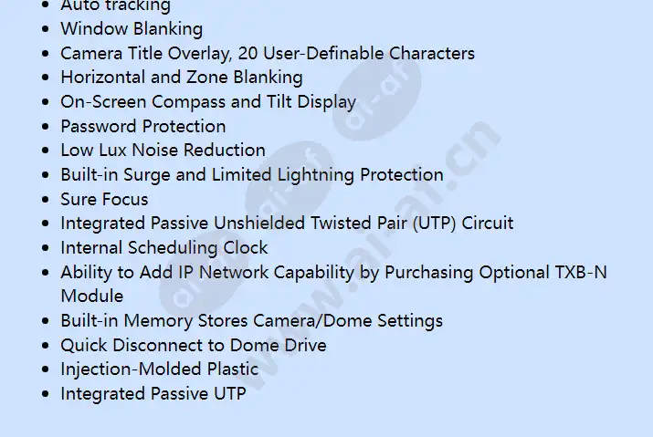The SD429-SMW-0-X from Pelco 540 TVL Indoor White Smoke Analog Dome Camera, 29x Lens. It was designed with ease of installation and ease of maintenance in mind. Each dome system consists of three components: a back box, a dome drive, and a lower dome. These three system components are interchangeable with other Spectra IV SE dome systems, making retrofitting and application adjustments simple. Also, dome drives and lower domes can be removed and replaced reducing maintenance time. Features 2 Autofocus, High Resolution Integrated Camera/Optics Packages; Multiple Back Box Models Day/Night, 540 TVL, 128X Wide Dynamic Range (WDR), and Motion Detection Auto tracking Window Blanking Camera Title Overlay, 20 User-Definable Characters Horizontal and Zone Blanking On-Screen Compass and Tilt