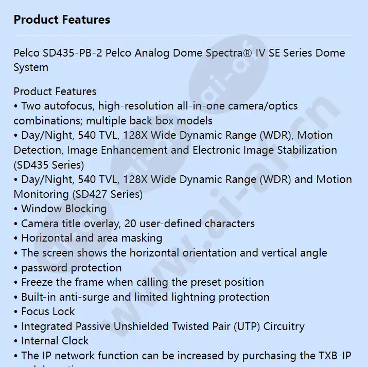 Pelco SD435-PB-2 Pelco Analog Dome Spectra® IV SE Series Dome System • Two autofocus, high-resolution all-in-one camera/optics combinations; multiple back box models • Day/Night, 540 TVL, 128X Wide Dynamic Range (WDR), Motion Detection, Image Enhancement and Electronic Image Stabilization (SD435 Series) • Day/Night, 540 TVL, 128X Wide Dynamic Range (WDR) and Motion Monitoring (SD427 Series) • Window Blocking • Camera title overlay, 20 user-defined characters • Horizontal and area masking • The screen shows the horizontal orientation and vertical angle • password protection • Freeze the frame when calling the preset position • Built-in anti-surge and limited lightning protection • Focus Lock • Integrated Passive Unshielded Twisted Pair (UTP) Circuitry • Internal Clock • The IP network