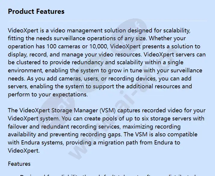 VideoXpert is a video management solution designed for scalability, fitting the needs surveillance operations of any size. Whether your operation has 100 cameras or 10,000, VideoXpert presents a solution to display, record, and manage your video resources. VideoXpert servers can be clustered to provide redundancy and scalability within a single environment, enabling the system to grow in tune with your surveillance needs. As you add cameras, users, or recording devices, you can add servers, enabling the system to support the additional resources and perform to your expectations. The VideoXpert Storage Manager (VSM) captures recorded video for your VideoXpert system. You can create pools of up to six storage servers with failover and redundant recording services, maximizing recording