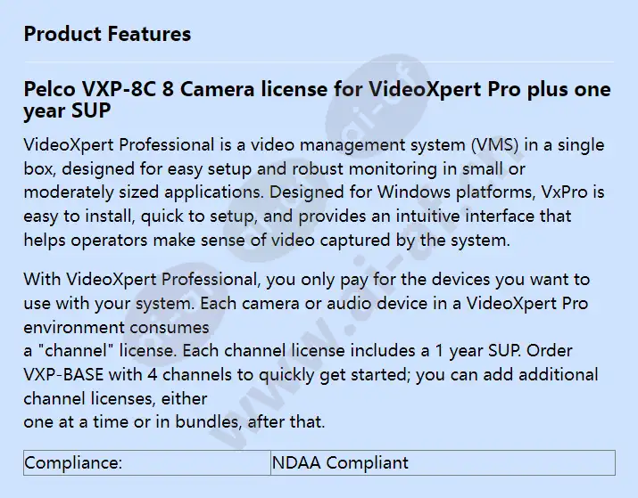 Pelco VXP-8C 8 Camera license for VideoXpert Pro plus one year SUP VideoXpert Professional is a video management system (VMS) in a single box, designed for easy setup and robust monitoring in small or moderately sized applications. Designed for Windows platforms, VxPro is easy to install, quick to setup, and provides an intuitive interface that helps operators make sense of video captured by the system. With VideoXpert Professional, you only pay for the devices you want to use with your system. Each camera or audio device in a VideoXpert Pro environment consumes a "channel" license. Each channel license includes a 1 year SUP. Order VXP-BASE with 4 channels to quickly get started; you can add additional channel licenses, either one at a time or in bundles, after that. Compliance: NDAA