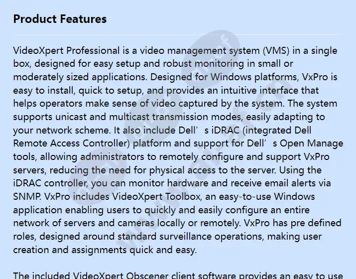VideoXpert Professional is a video management system (VMS) in a single box, designed for easy setup and robust monitoring in small or moderately sized applications. Designed for Windows platforms, VxPro is easy to install, quick to setup, and provides an intuitive interface that helps operators make sense of video captured by the system. The system supports unicast and multicast transmission modes, easily adapting to your network scheme. It also include Dell’s iDRAC (integrated Dell Remote Access Controller) platform and support for Dell’s Open Manage tools, allowing administrators to remotely configure and support VxPro servers, reducing the need for physical access to the server. Using the iDRAC controller, you can monitor hardware and receive email alerts via SNMP. VxPro includes
