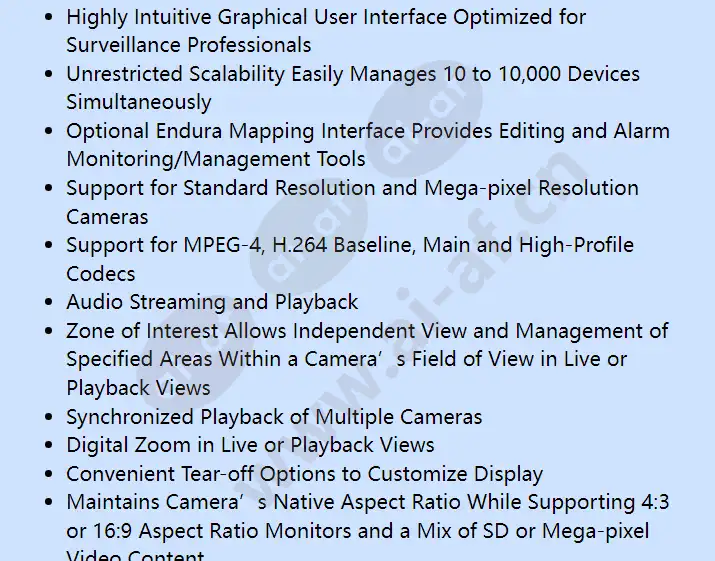 The Endura workstation is a high-end personal computer running Windows Vista Business edition that is optimized for the WS5000 advanced system management software. The Endura workstation can decode and display up to 16 video streams simultaneously and can process up to 30/25 (NTSC/PAL) images at 4CIF resolution per second, per stream. The Endura workstation includes the WS5000 software package. The WS5000 software provides access to all operation and configuration features of the Endura system in a unified, intuitive, graphical user interface. The interface has been optimized for the demanding needs of surveillance professionals and utilizes drag-and-drop operations, shortcut menus, built-in tooltips and online Help to enable the most direct, intuitive interactions with cameras and