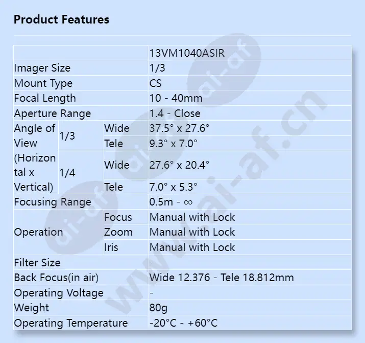 13VM1040ASIR Imager Size 1/3 Mount Type CS Focal Length 10 - 40mm Aperture Range 1.4 - Close Angle of View (Horizontal x Vertical) 1/3 Wide 37.5° x 27.6° Tele 9.3° x 7.0° 1/4 Wide 27.6° x 20.4° Tele 7.0° x 5.3° Focusing Range 0.5m - ∞ Operation Focus Manual with Lock Zoom Manual with Lock Iris Manual with Lock Filter Size - Back Focus(in air) Wide 12.376 - Tele 18.812mm Operating Voltage - Weight 80g Operating Temperature -20°C - +60°C