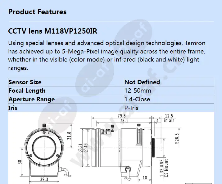 CCTV lens M118VP1250IR Using special lenses and advanced optical design technologies, Tamron has achieved up to 5-Mega-Pixel image quality across the entire frame, whether in the visible (color mode) or infrared (black and white) light ranges. Sensor Size Not Defined Focal Length 12-50mm Aperture Range 1.4-Close Iris P-Iris Product specification Attribute Value Name M118VP1250IR Sensor size 1/1.8″ Mount CS Resolution 5MP Focal length 12-50mm Aperture type Auto P-Iris Aperture range 1.4-Close MOD 1m – ∞ Focus Manual, with lock Weight 128g Spectral range Visible-NIR Optical overall length 92mm Maximum diameter 51mm Operating temperature -20°C to +60°C