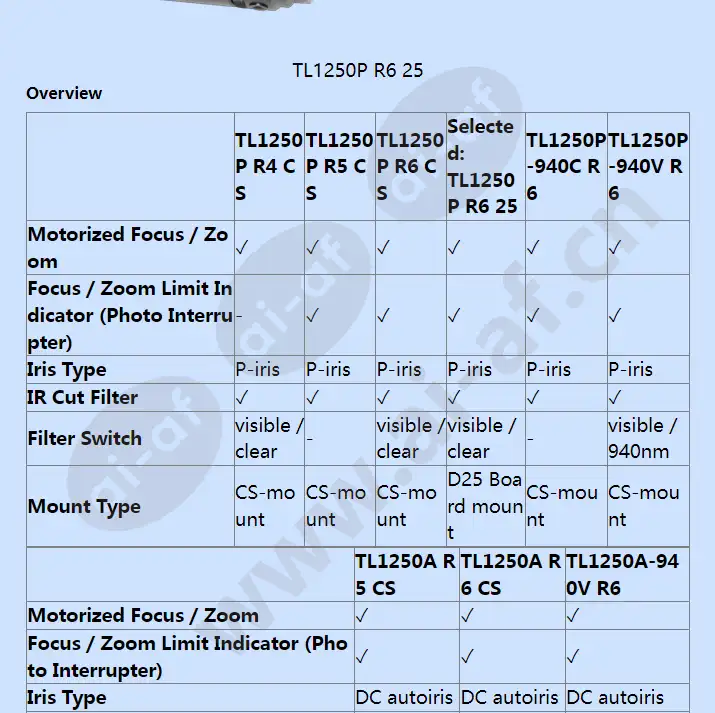 Motorized 4k Telephoto: TL1250 -R 1250 -R versions replaced with 1250 -N versions . 1250-N versions have slightly larger focus/zoom motors, but the optics design is identical to the -R version. Ultra high resolution, long distance telephoto lens 12 - 50 mm focal range True 4K, 12 megapixel resolution Fully motorized with zoom, focus, iris. Some models include IR cut, and limit switches IR corrected for Day/Night For 1/1.7" sensor sizes or smaller Compact design to fit into domes as small as 4” mini-dome size TL1250P R6 25 Overview TL1250P R4 CS TL1250P R5 CS TL1250P R6 CS Selected: TL1250P R6 25 TL1250P-940C R6 TL1250P-940V R6 Motorized Focus / Zoom ✓ ✓ ✓ ✓ ✓ ✓ Focus / Zoom Limit Indicator (Photo Interrupter) - ✓ ✓ ✓ ✓ ✓ Iris Type P-iris P-iris P-iris P-iris P-iris P-iris IR Cut Filter ✓