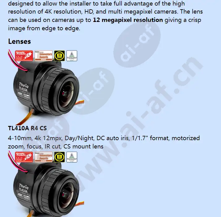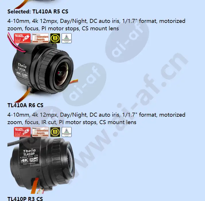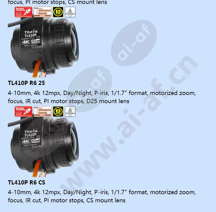 Theia TL410A R5 CS 4-10mm 4k 12 MP Day/Night DC auto iris 1/1.7 inch format motorized zoom focus PI motor stops CS mount lens