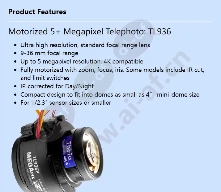 Theia TL936P R6 CS 9-36mm 5+ MP Day/Night 1/2.3 inch P-iris motorized zoom & focus IR cut PI motor stops CS mount telephoto lens